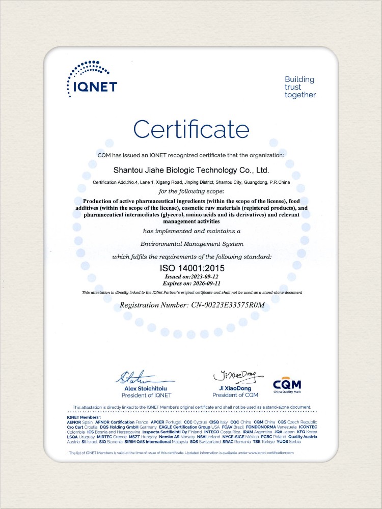 汕頭佳禾生物科技有限公司是一家致力于氨基酸及其衍生物研發(fā)、生產(chǎn)和銷售的國家高新技術(shù)企業(yè),先后通過了國家藥品GMP認(rèn)證,ISO9001質(zhì)量體系認(rèn)證、ISO14001環(huán)境管理體系認(rèn)證。目前,公司擁有“廣東省專精特新中小企業(yè)”、“廣東省氨基酸產(chǎn)品工程技術(shù)研究中心”、“汕頭市生物發(fā)酵工程技術(shù)研究開發(fā)中心”、“汕頭市知識(shí)產(chǎn)權(quán)優(yōu)勢企業(yè)”、“多項(xiàng)國家發(fā)明專利”、“廣東省守合同重信用企業(yè)”等多項(xiàng)資質(zhì)和榮譽(yù),旗下“佳禾牌”系列產(chǎn)品已成為原料藥行業(yè)知名品牌。 新泰市佳禾生物科技有限公司成立于2012年8月,注冊資金2億元,公司位于山東泰安新泰市新汶工業(yè)園區(qū),是國 家級高新技術(shù)企業(yè)、山東省“專精特新”企業(yè)、山東省制造業(yè)單項(xiàng)冠軍企業(yè)、泰安市科技型中小企業(yè)、泰安市農(nóng)業(yè)產(chǎn)業(yè)化龍頭企業(yè)、中國生物發(fā)酵產(chǎn)業(yè)協(xié)會(huì)理事單位。